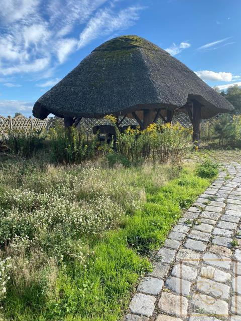 Działka jest zagospodarowana poprzez liczne nasadzenia roślin ozdobnych i drzewek owocowych.
