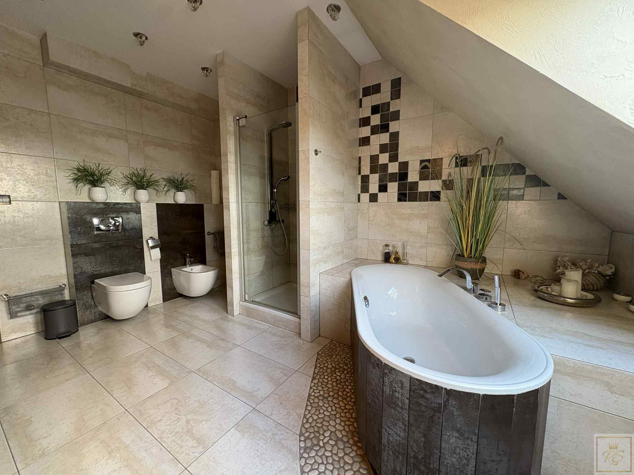 • Pokój kąpielowy z kabiną prysznicową i wanną — miejsce, gdzie odpoczniesz po intensywnym dniu