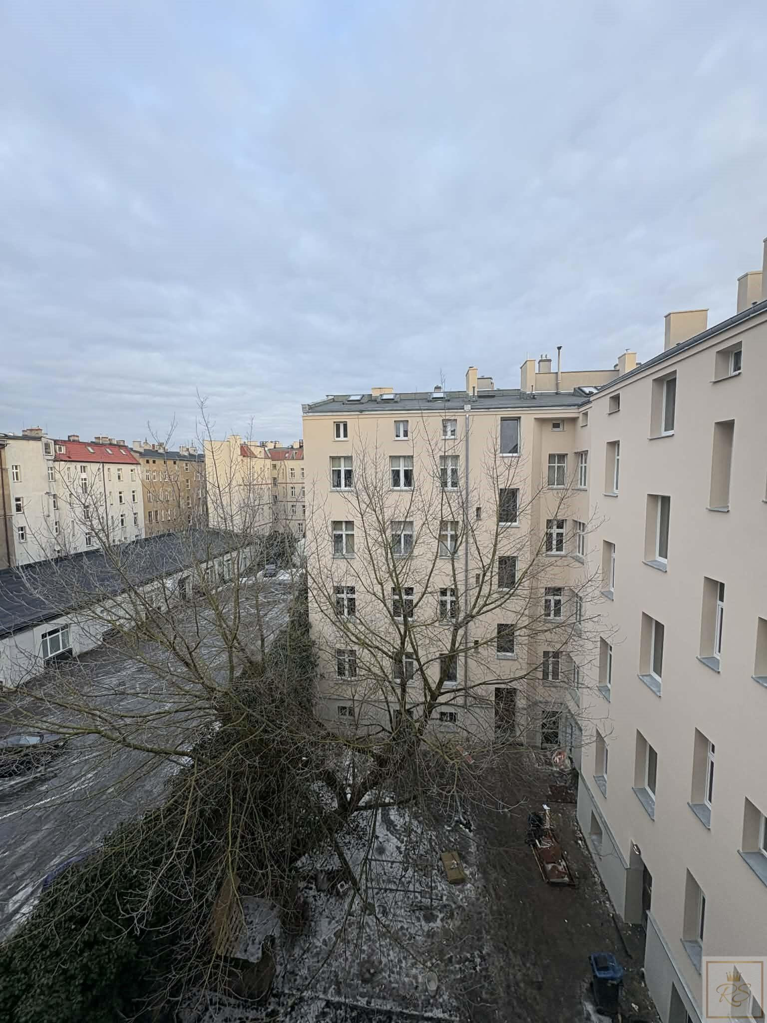 Brak piwnicy i balkonu. Widok na odnowiony dziedziniec.